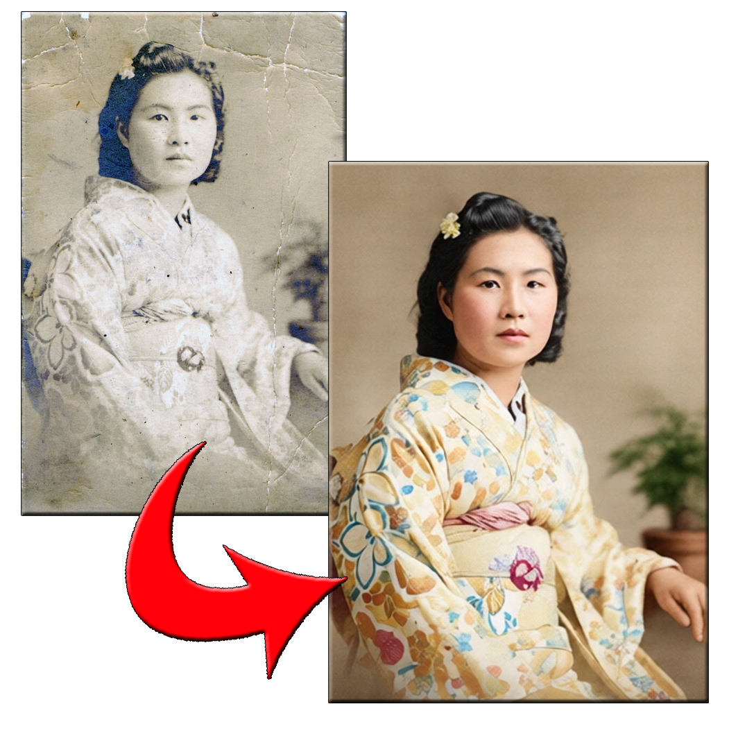 最新のAI技術と専門店ならでは手作業による補正によって、当時の雰囲気を大切にしながら、違和感のない仕上がりへ。